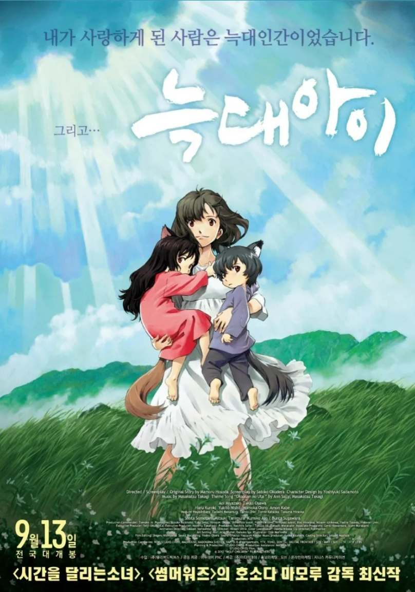우아함과 강인함으로 그려지는 하나는 이 영화의 감성적인 부모의 역할을 한다. 늑대의 아이들에게 양육 환경을 제공하겠다는 그녀의 변함없는 사랑과 결단력이 그녀의 성격을 규정한다. 관객들은 하나가 의문의 남자에게 한눈에 반해서 대학생에서 인간과 늑대의 형태를 바꿀 수 있는 능력을 가진 아이들을 키우는 도전에 직면한 회복력 있는 엄마로 성장하는 것을 목격한다. 하나의 특징은 이타심, 적응력, 강인 정신으로 나타난다. 그녀의 목적은 기존의 모성 역할을 초월하는데, 이는 갑작스러운 파트너의 상실 이후 부모됨의 복잡성을 홀로 항해하기 때문이다. 하나는 어머니의 사랑의 힘을 형상화하고, 그녀의 여정은 자녀 양육이라는 보편적 경험 안에 내재된 희생과 승리의 증거가 된다. 유키는 활기차고 호기심 많은 본성을 가지고 있다. 그녀의 늑대의 형태로, 그녀는 유년기의 탐험의 풍부함을 반영하며, 들판의 자유를 즐긴다. 그녀가 성숙함에 따라, 유키의 특징들은 자아 발견의 보편적인 여정을 반영하도록 진화한다. 그녀의 목적은 청소년기의 도전들을 항해하는 누구에게나 울려 퍼지는 투쟁인 그녀의 정체성의 인간적인 측면과 늑대적인 측면 사이의 간극을 메우는 것에 있다. 그녀의 선택과 경험은 관객이 정체성, 사회적 기대, 내재적 소속 욕구 등의 주제를 탐구하는 렌즈가 되기 때문에 유키의 성격은 서사에 역동적인 층위를 더한다. 그녀의 여정은 개인성을 수용하는 것과 사회적 규범에 순응하는 것 사이의 미묘한 균형에 대해 보여준다. 늑대 형제 중 동생인 아메는 누나와는 대비되는 성격을 가지고 있다. 내성적이고 사색적인 아메는 자연계의 신비에 끌린다. 그의 캐릭터는 인간 생명의 안전과 길들여지지 않은 숲의 매력 사이에서 갈팡질팡하는 존재의 이중성을 구현한다. 아메의 목적은 우리의 정체성을 규정하는 데 있어 우리가 내리는 선택에 대한 성찰로서 전개된다. 소심한 어린 늑대에서 자신의 길을 추구하는 단호한 개인에 이르는 그의 여정은 개인의 자율성에 대한 영화의 탐구와 자신의 운명을 형성하는 데 필요한 용기를 강조한다.